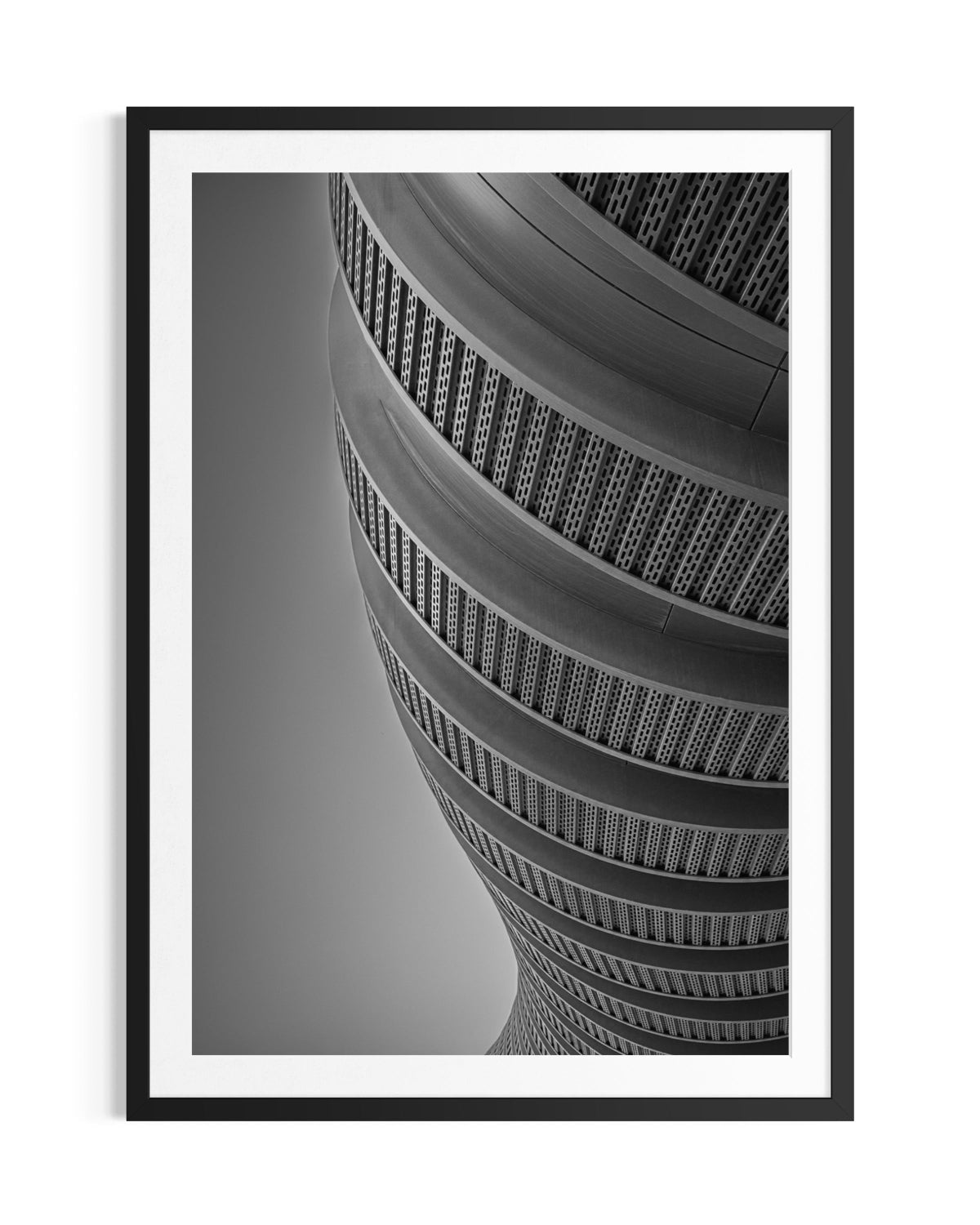 This image captures the elegance of modern architecture through a spiral form. Shot from an upward angle, the structure rises with a sense of movement and depth. Repeating bands of metal and subtle textures guide the eye, while the minimalist sky provides balance and contrast. The image highlights shape, light, and shadow, allowing the geometry and rhythm of the design to speak for themselves.